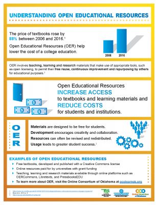 OUR MISSION: Open educational resources (OER) will equip the Oklahoma State System for Higher Education and Oklahoma institutions to create opportunities for diverse, equal, and collaborative knowledge creation and dissemination for students through no-cost, openly-licensed materials.